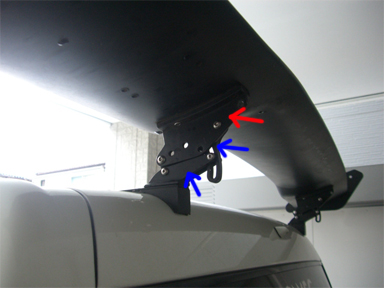 赤矢印が穴あけ加工した、3DGTウイングのステーで青矢印が以前の2枚羽のステーです。 この組み合わせで装着できました(ちょっと不格好かもですが(;^_^A アセアセ・・・) |