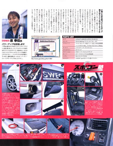 パーツも事細かく写真&説明を載せてくれています。間違っているところもありますが(^_^;)(サスがHKSになってました(以前のサス)) また間近にもターボかスーパーチャージャーを取り付けようと目論んでるように書いてますが、もちろんそれは夢でして、当分あり得ません(^_^;) |