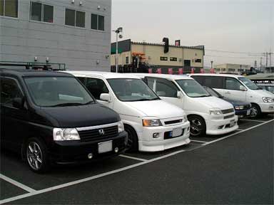先日、MLで少し話題となったベロフのSUPER WIDE LEDをSWECのNOSEさんが新型には合わないということで、お安く譲ってくださることになり、受け渡しをかねて、スーパーオートバックス高槻店にて超ミニオフミを行いました。 手前からNOSEさん号、Koh号、ダブルナットさん号です。 |