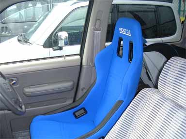 マーニーさんのスパルコのバケットシートです。座らせて頂きましたが、確かにフルバケは乗り降りは若干不便ですが一端座ってしまうと、すばらしいホールド感!!Kohのリクライニングのレカロとは比べ物になりません。 |