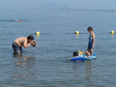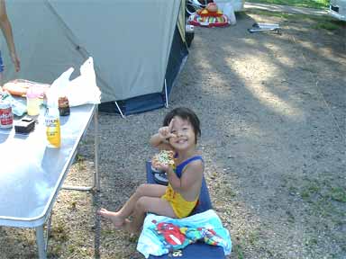 泳ぎの途中にちょいとおやつタイム。 ダブルナットさんの次男、まなやくんがソースマヨせんべいを持ってご機嫌♪ |
