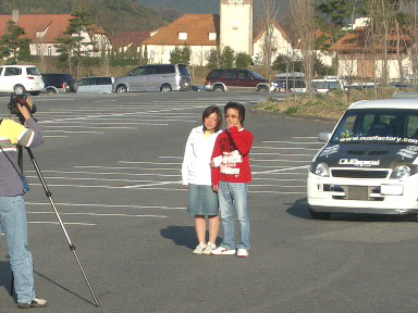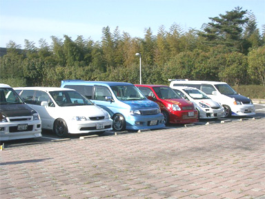 手前はkenkenさん家のFit。 で、今回オプションワゴンの方々が取材に来てくださったのですが、参加車の中から次回表紙を飾るマシンを選ぶとのこと! そして選ばれたのがこのオレンジのアコードワゴンとその向こうにある赤のCAPA(kenkenさんの妹、ふみさんのマシン)です\(^O^)/ さすが完成度高い2台ですね。私も表紙に載りたい〜(;^_^A アセアセ あっ、かなり向こうの方に見える軽バンはもしかして。。。。(謎) |