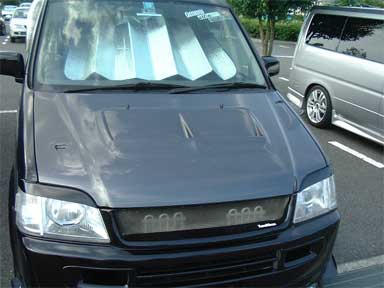 見てください、このボンネット! 純正のボンネットを穴開けし、汎用のダクトを3つもぶち込んだ、スペシャルボンネットです。しかもカラーはGT-Rのガンメタに塗装!\(^O^)/ |