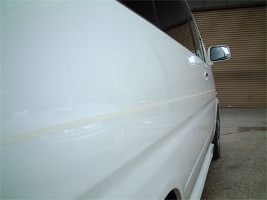 いきなり完成(^_^;)。作業に熱中して途中のを撮り忘れました(^_^;)。 上の画像のマスキングの後、脱脂し、中性洗剤を少し混ぜた水を霧吹きで吹き付けます。 その塗れた状態の上からデコラインを貼り、さらに保護シートの上からもう一度霧吹きを吹き付け、付属のスキージーで水分を出しながらデコラインを押しつけます。 その後、デコライン上の保護シートを慎重に外せば完成です。 |