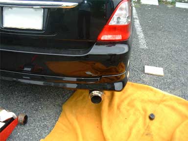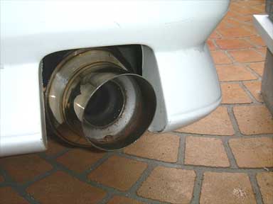 交換作業前にリアのWALDハーフエアロを取り外しました。リアが無いだけですごいブサイクですね(^_^;) マフラーの砲弾の形が見えるのはかっこいいですが。。 |