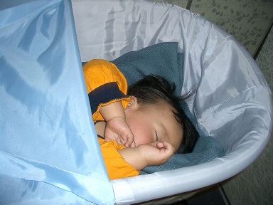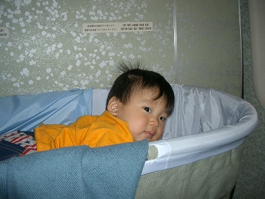 事前に言っておけばこのような”バシネット”というベビー用のベッドをかしてくれます。ただ装着出来る座席が決まっていますが(前が壁になっているところ)