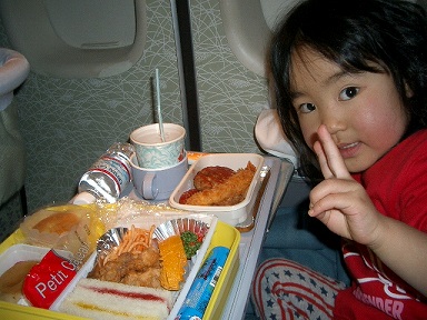 お姉ちゃんはご機嫌で機内食を満喫中♪ |