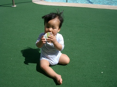 まだ_プールには入れないけど、広くて人工芝が綺麗なんで、息子もその辺をハイハイ。 |