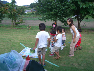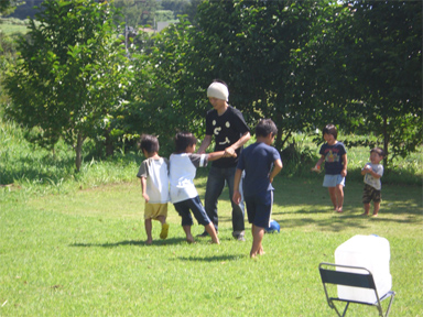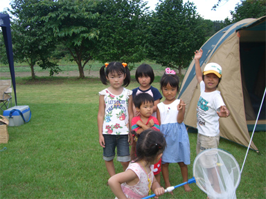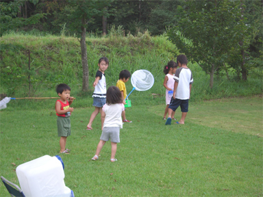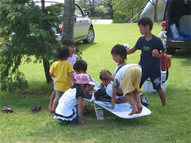 早速子供たちは虫取りや思い思いの遊びで芝生を駆け回ります(^^;; 子供たちもみんなそれぞれ大きくなって、勝手に遊んでくれるので親たちは楽ですね〜 |