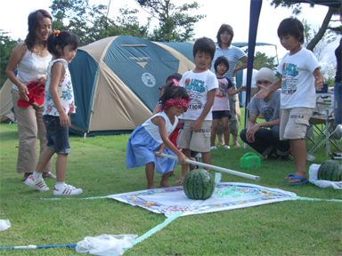 そんな中、ビーチじゃなく山キャンプですが、スイカ割りが始まりました。 |