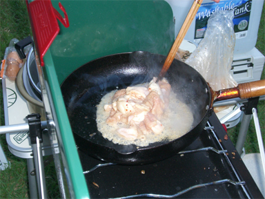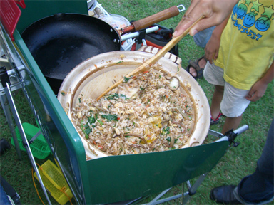もちろんこれもございます! むしさん定番のモツ入り焼きうどん! これもやっぱり絶品♪ 毎回これを食べたいためにキャンプに参加していると言っても過言ではありません(^^;; |
