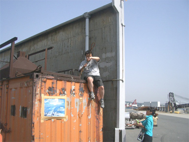 コンテナの上に登って、上からの撮影をしたたろやんさんですが、降りられなくなってます(笑) |