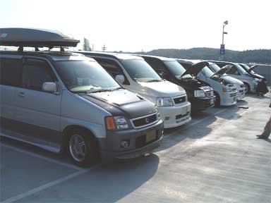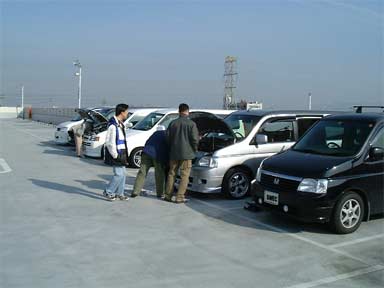 こちらはtosさんのマシン。 カーボンボンネットがほんとにいかつい!しかもめちゃ軽かったです。ますますレーシー路線まっしぐらのtosさん号です。 あっ、右のけんまささんのマシンのドアミラーは噂のDOOV製ウインカー内蔵ドアミラーです。小さすぎてわからん?(^_^;)。実物はかなりかっちょよかったです。 |