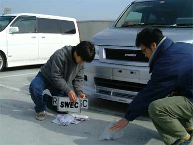 続いて、ともきさんが解体屋からゲットしてこられたユーロナンバーをみんみんさんのマシンに装着。 |