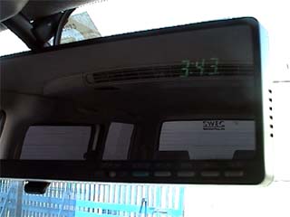 ステッピーには時計が無いので、カーステの時計を見てましたが、ミラー上に時計が映し出されるルームミラーをオークションでGET。装着しました。なかなか便利です(画像見えるかな?)。電池式ではありません。配線はピラーを通して綺麗に仕上がりました。 *現在は取り外しています(2003年現在) |