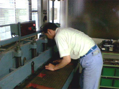 ということで付属のステーを固定するためのステーを自作することにしました。 勤務先の太田さん((謎))にシャーリングで鉄板を指定したサイズの長方形にカットしてもらってます(笑) *この画像は携帯で撮影 |