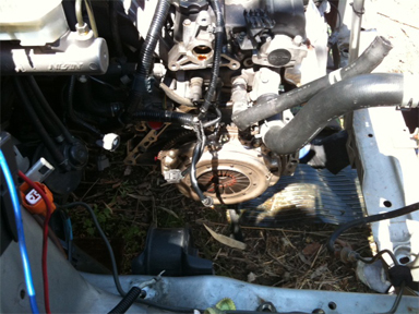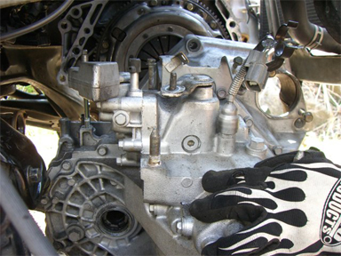 某山奥で、屋外のしかも土の地面上での作業です(^^;) MT化出来る嬉しさ反面、Seraby号がばらされて行くのは寂しいですね。。 |