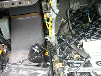 シフトのケーブルを通すのに、コンピューターの奥側に大穴を開ける予定で、そのためにコンピューターの位置もずらさないといけないんですが、ATケーブルが通っていた穴を利用して這わしてみたら、上手い具合に装着出来、穴を開けずに済みました! |