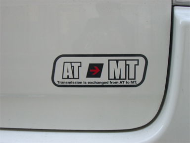 せっかくMTにしたので、ちょっとアピールしたいなと、MT化のステッカーを自分でデザインしてみました。 英文は間違ってるかもですが、なんとなくのニュアンスで許してください(爆) |