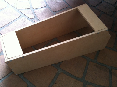 で、それを組み合わせて木ネジで固定。下穴をドリルで開けましたが、ネジが長すぎ&MDFが薄かったので、ちょっと割れが発生しましたが、なんとか組み立てられました。 ま、初心者ですからこんなもんでしょ (;^_^A アセアセ・・・ |
