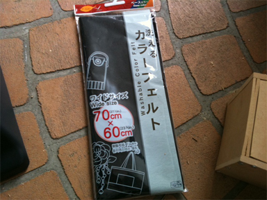 そして周りにはダイソーで買ったフェルト生地を貼り付けます。貼り付けもダイソーで買った両面テープ(笑) |