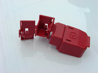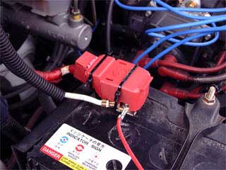 上の画像のようにパワーフローとインチャンを取り付けることにより、インチャンがまともにバッテリーの+端子上に来ます。 クリアランスがギリギリでこのままだと危険なので、爆音PaPaさんのアドバイスにより、ストリームに付いているプラスチック端子カバー(部品番号32418-PLA-300、\400)を購入しました(NEWシビックにも同じ物がついています)。 |