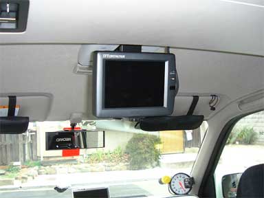 画像のように、天井のエアコン部分と、ルームランプの間にステーを装着し、手動ですが、モニターは折りたためるようになっています。 |