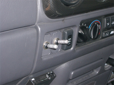 室内の空いてるめくら蓋にトグルスイッチをつけ、上にしてればONでスモールONと同時に点灯。下に下げれば任意でOFF出来るようにしました。 ちなみに左のトグルが今回の室内ネオンで、右はアンダーネオンのスイッチです(アンダーも動作は同じ)。 |