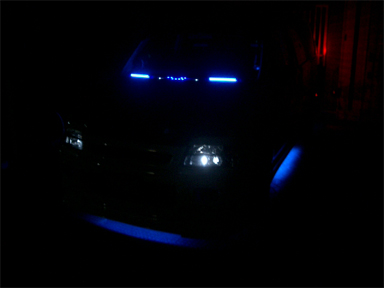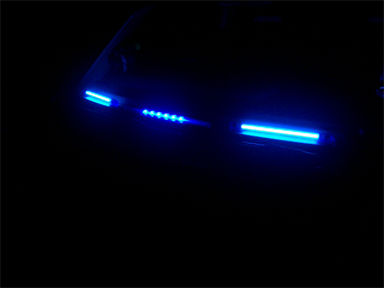 ブルーネオンをフロント左右に。中央にフラッシャーを装着しました。 どこかで見た配列ですね。そうです、完全にたろやんさんの室内ネオンのパクリです(笑) |