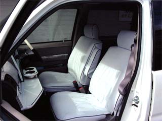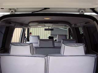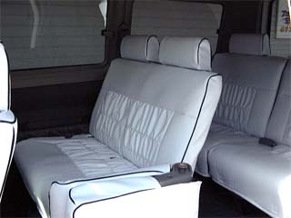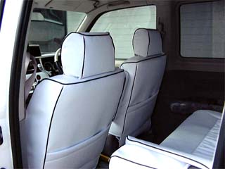 レザー調のシートカバーを装着しまいた。 メーカーは大阪の堺にある”クラブ・バラムンディ”というショップオリジナルです。価格は3列すべてでなんと\29800!しかし値段の割には作りも結構しっかりしています。 |