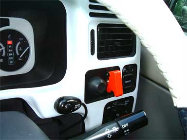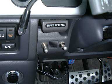 このスタータースイッチの場所に以前付けていた、二つのトグルスイッチはサイドブレーキの解除レバーの下部辺りに移設しました。 右のトグルはVIPERのエンスタボイスのON/OFFスイッチ。(エンスタをかけると日本語で「エンジンを始動します。車から離れてください。アイドリング中です。注意してください。」と喋るのですが、朝自宅で、それをやると近所に迷惑なので、これでOFFにしています。前日に降りるときにOFFにし忘れてしまうと意味ありませんが(^_^;)) 左のトグルは同じくセキュのゼファ(セキュ機能は使ってません)のボイス選択/発声スイッチです。(トグルを下にすることで、ボイスを選択。上にして発声します。”サンキュー”やら”ハロー”、”あははは(笑い声)”等、お遊びセキュです(^_^;) 近所の子供達に受けがよいです。 |