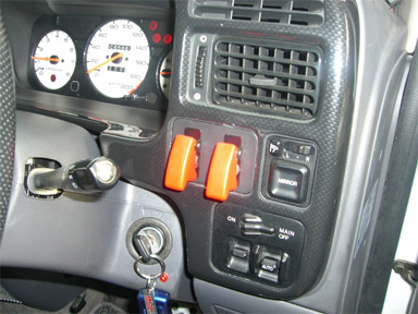 ということで、スタータースイッチが以前から不調なんで取っ払い、戦闘機スイッチを2つ装着。 一つは今回のストロボ用で、もう一つはサスペンションライティングシステム用です。 |