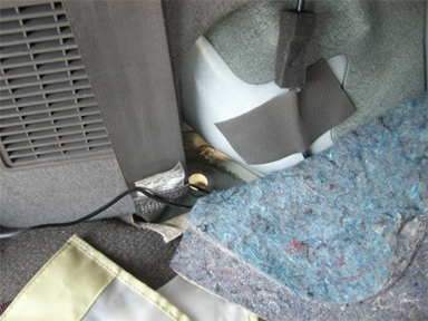 リアはフロアカーペットをめくってみるとタイヤハウスより少し後ろ側になにやらパッキンが。 外してみるとすぐ地面が見えたので、このパッキンに穴を開けて線を通すことに。 この穴は両サイドにありました♪ |