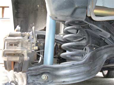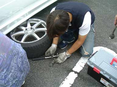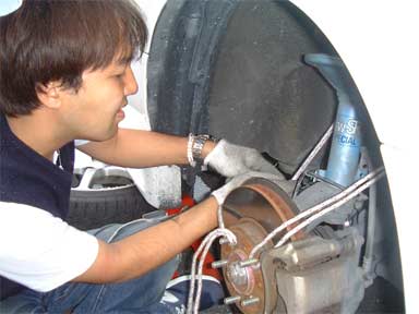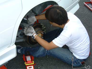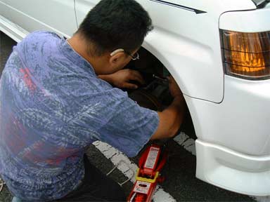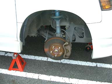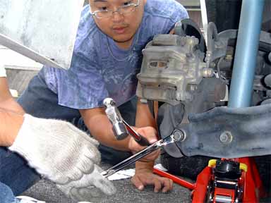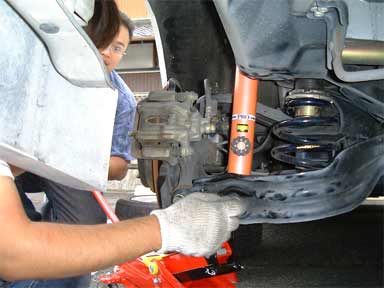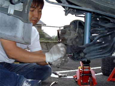 早速取り外し開始です。 ロアアームのボルトを取り外している私(今回私が画像に多く登場します(^_^;)というのも作業に必死で全然撮影してなくて、私のカメラでkenkenさんがほとんど撮影してくださいましたので(爆)) |