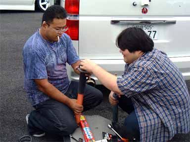 このS-Sはピロアッパーでしたので、nonoriさんと私でピロを調整しています。 1目盛りが何℃のキャンパー角なのかわかりませんが、とりあえず2目盛りネガキャンにしました(^_^;) |