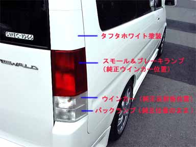 字が読めませんね(^_^;)。上から タフタホワイト塗装 スモール&ブレーキランプ(純正ウインカー位置) ウインカー(純正反射板位置) バックランプ(純正位置のまま) という配列にしました。 もともとコンプレッサーさんも上半分はカバーを装着し、反射板部分にソケットが入るように穴開け加工されてましたので、そのまま流用しています。 |