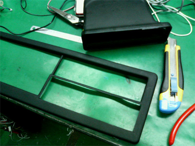 現在オーディオ部分はPanasonicの3DINパネルを使用し左は2DINオーディオ、右上はインダッシュモニター、右下は小物入れとなっているのですが、将来こういうこともあろうかと以前これまたヤフオクでこの3DINパネルの枠だけを安く入手し、加工用として保管してました。 いよいよそれの出番です(^_^;) 右下の小物入れを取り外し、3連メーター用のパネルが入るよう現物合わせでカッターで広げます。 |