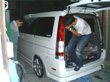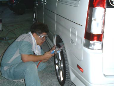 車を揺すってフェンダーが当たるか確認中の図(揺すってるのは私です(^_^;)) 撮影協力:ダブルナットさん |