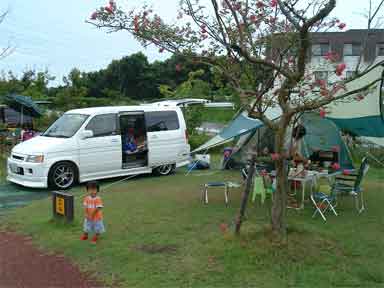こちらはσ(^_^)のサイトです。設営はたあ坊さんが手伝ってくださいましたm(__)m 手前にいるのは、娘の彩乃です。 初めてのキャンプはどうだい?(^_^;) |