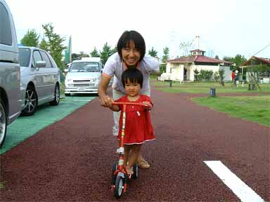 嫁さんと彩乃。 子供用のキックボード?でご機嫌! おいおい、誰のや〜。うちそんなん持ってないで〜(^_^;) 借してくれた女の子は彩乃の面倒も見てくれ、一緒に遊んでくれました。ありがとう!(どなたのお子さんだったかわかりませんでしたm(__)m) |